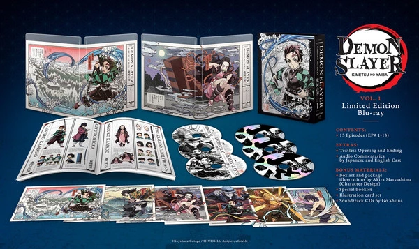Demon Slayer: Kimetsu no Yaiba Volume 1 Limited Edition contains episodes 1-13 of the anime directed by Haruo Sotozaki and is housed in an Art Box which contains a Special Booklet featuring character art and scene designs along with staff commentaries, Illustration Card Set, and 3-CD Soundtrack.
