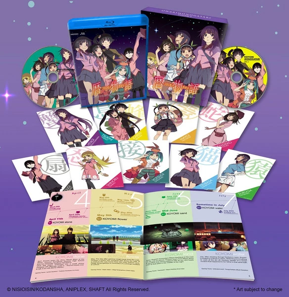 Koyomimonogatari contains 12 short episodes of the anime directed by Akiyuki Simbo, plus a deluxe booklet, pin-up postcard set, and package illustrated by Akio Watanabe (Character Designer).*