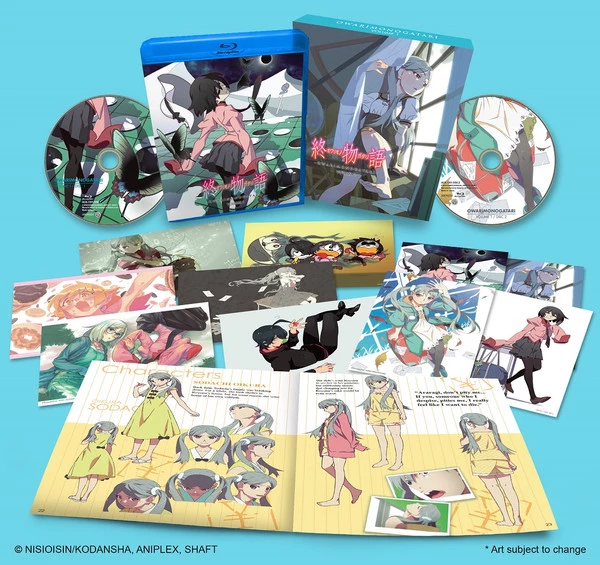 Owarimonogatari Volume 1 contains 7 episodes of the anime directed by Akiyuki Simbo (OUGI FORMULA #1&2 / SODACHI RIDDLE #1&2 / SODACHI LOST #1-3) plus a deluxe booklet and a pin-up postcard set.