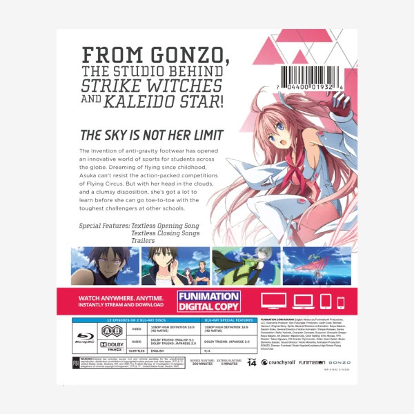 Asuka Kurashina is starting a new year of high school on Kuna Island, where students don’t walk to class…they fly! The invention of anti-gravity footwear has opened an innovative world of sports for students across the globe. Dreaming of flight since childhood, Asuka can’t resist the action-packed competitions of Flying Circus. But with her head in the clouds and a clumsy disposition, she’s got a lot to learn before she can go toe to toe with the toughest challengers at other schools. Luckily, her new friends are some of her best rivals who will push her skills to unimaginable heights. Finding their specialties and perfecting their techniques, everyone’s aiming for the top, but only one can win the tournament!