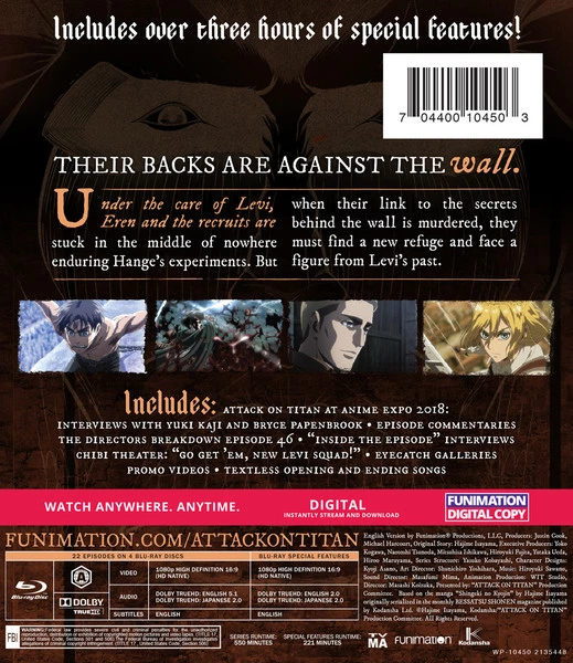 Special Features: Attack on Titan at Anime Expo 2018: Interviews with Yuki Kaji and Bryce Papenbrook, Episode Commentaries, The Directors Breakdown Episode 46, Inside the Episode Interviews, Chibi Theater: “Go Get ‘Em, New Levi Squad!”, Eyecatch Galleries, Promo Videos, Textless Opening and Ending Songs.