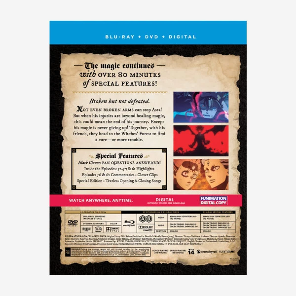 Special Features: Black Clover: Fan Questions Answered by Cris and Dallas, Inside the Episode, Episode 56 Commentary, Episode 62 Commentary, Clover Clips Special Edition, Textless Songs.