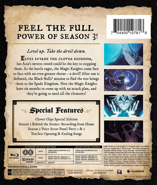 Special Features: Textless Opening Songs “RiGHT NOW”, “Black Catcher”, “Stories” and “Everlasting Shine”, Textless Closing Songs “Life is a Battlefield”, “New Page”, “Answer” and “A Walk”, Clover Clips Special Edition, Black Clover Season 3 – Recording From Home, Black Clover Season 3 – Voice Actor Panel Parts 1 and 2.