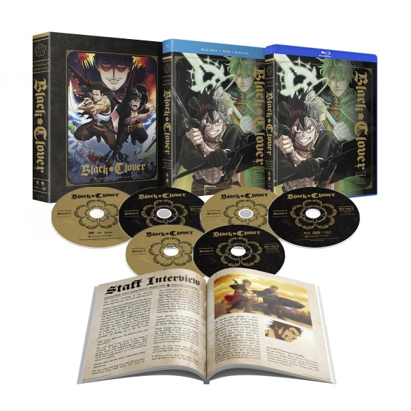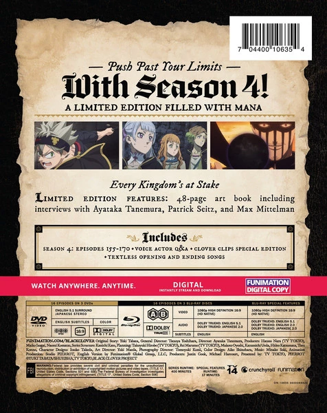 Black Clover Season 4 Limited Edition contains episodes 155-170 of the anime series directed by Tatsuya Yoshihara and Ayataka Tanemura, and includes a 48-page art book featuring interviews with Ayataka Tanemura, Patrick Seitz and Max Mittelman.