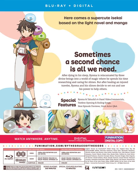 Special Features: Voice Actor Q&A, Pre-reincarnation Ryoma & Tabuchi’s 4 Panel Video, “Slimes’ Idle Conversation” – By the Grace of the Gods Introduction, Home Video Original – “Slimes’ Idle Conversation: Ryoma Is on Trial for Doing Too Much”, Next Episode Previews, Commercials, Textless Opening and Closing Songs