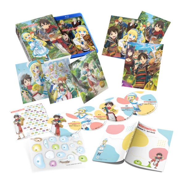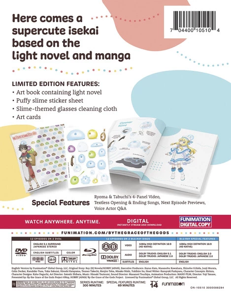 By the Grace of the Gods Season 1 Limited Edition Blu-ray contains episodes 1-12 of the anime directed by Takeyuki Yanase plus an Art Book containing a light novel, a Puffy slime sticker sheet, Slime-themed glasses cleaning cloth, and art cards.