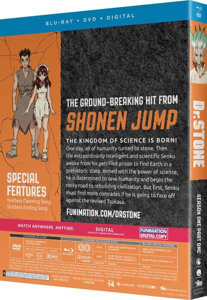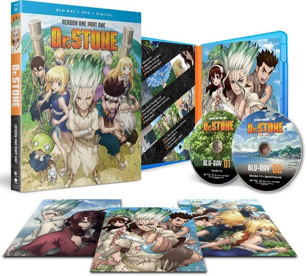 Dr. STONE Season 1 Part 1 contains episodes 1-12 of the anime directed by Shinya Iino, and includes 3 art cards (while supplies last.)