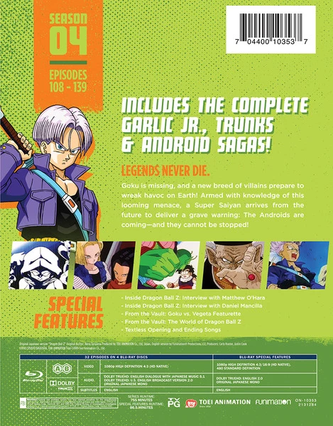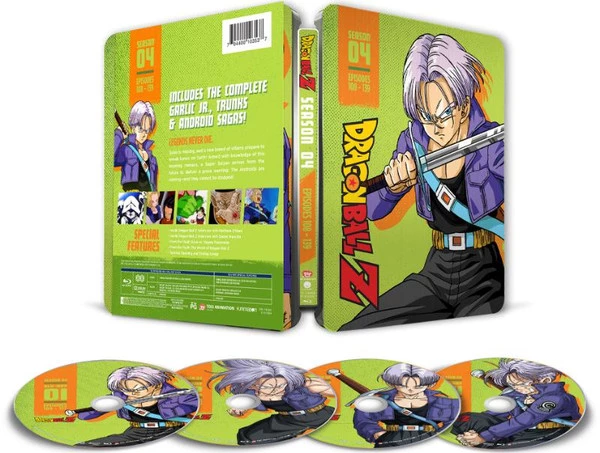 Dragon Ball Z Season 4 Steelbook contains episodes 108-139 of the anime directed by Daisuke Nishio and Shigeyasu Yamauchi, presented in a 4:3 aspect ratio and housed in a steelbook case.