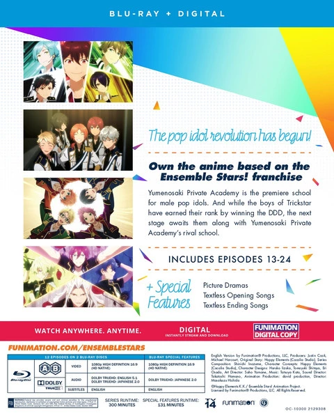 Ensemble Stars! Part 1 Blu-ray contains episodes 13-24 of the anime directed by Yasufumi Soejima and includes 6 art cards (while supplies last.)