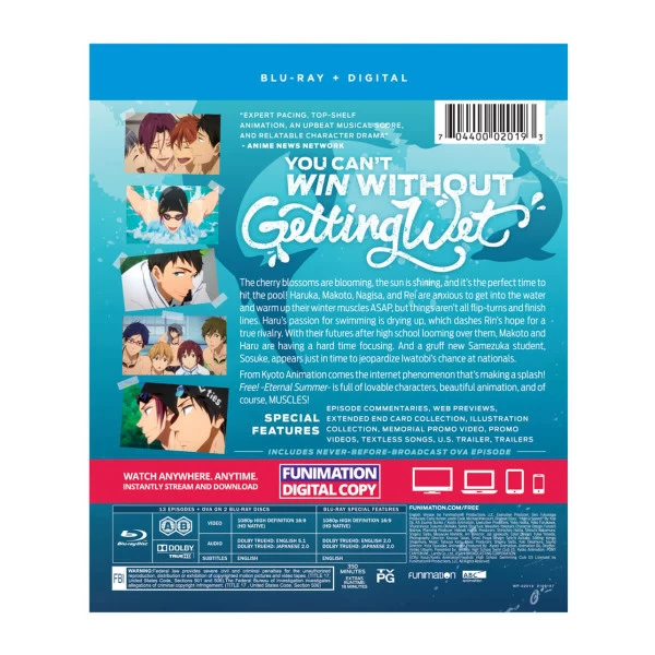 Free! Eternal Summer Season 2 Essentials contains episodes 1-13 of the anime plus the OVA directed by Hiroko Utsumi and produced by Kyoto Animation.