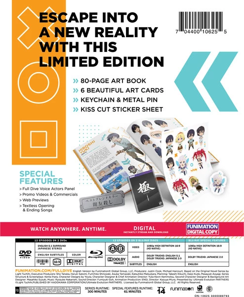 Full Dive: This Ultimate Next-Gen Full Dive RPG Is Even Shittier than Real Life! contains episodes 1-12 of the anime directed by Kazuya Miura and includes an 80 page art book, 6 art cards, metal pin, keychain and stickers, all housed in a Collector’s Box.
