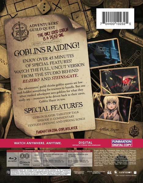 Special Features: Goblin Slayer: Tabletop Talk, Episode 11 Commentary, Textless Opening Song, Textless Closing Song.