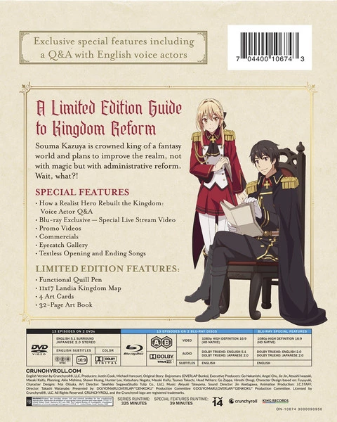 How a Realist Hero Rebuilt the Kingdom Part 1 Limited Edition contains episodes 1-13 of the anime directed by Takashi Watanabe, and contains a functional quill pen, 11″x17″ Landia Kingdom map, 4 art cards, and a 32-page art book.