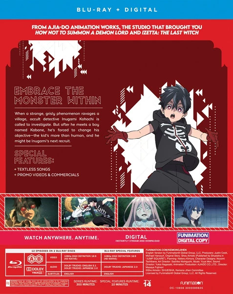 Kemono Jihen contains episodes 1-12 of the anime directed by Masaya Fujimori and includes a collectible art card (while supplies last.)