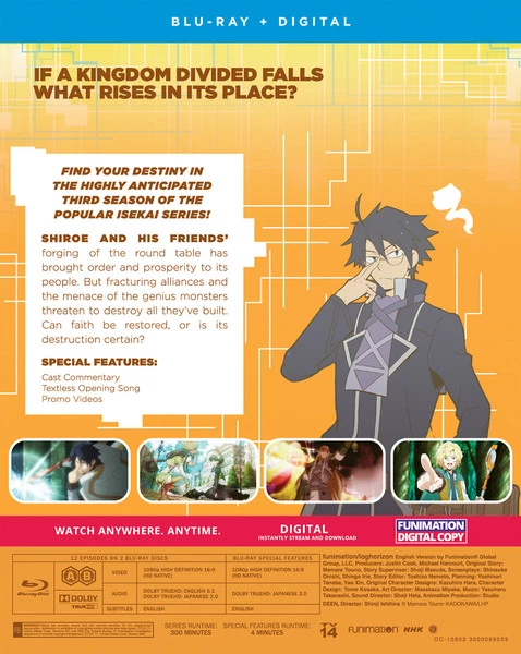 Log Horizon: Destruction of the Round Table contains episodes 1-12 of season 3 of the anime directed by Shinji Ishihira.