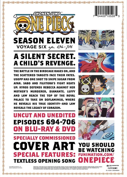 One Piece Season 11 Part 6 contains episodes 694-706 of the anime directed by Toshinori Fukazawa.