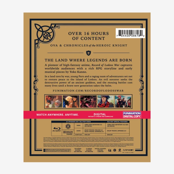 Record of Lodoss War OVA + Chronicles Essentials contains Record of Lodoss War OVA series episodes 1-13 on Blu-Ray plus Chronicles of a Heroic Knight episodes 1-27 on DVD.
