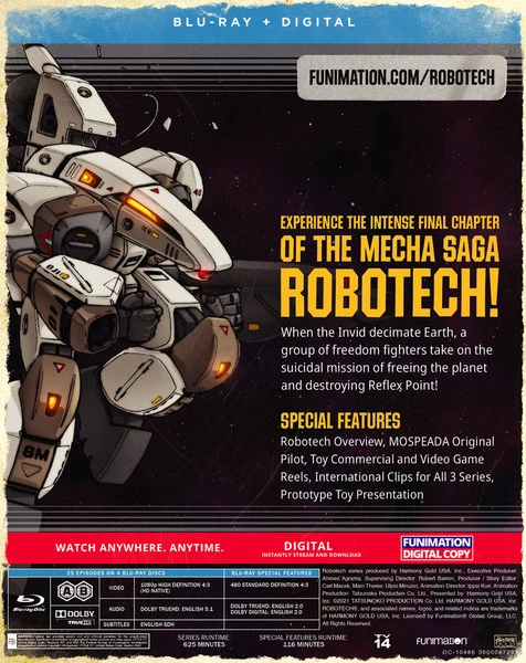 Special Features: Robotech Overview, Mospeada Original Pilot Part 1, Toy Commercials, Video Game Presentations, Prototype Toy Presentation, Merchandise Gallery – Toys, Miscellaneous Merchandise, Doll Line Fashion Designs, Activity Flyer, ARCO Toys Sellsheet, Robotech Novels Press Kit, RDF Fan Club Packet, International Clips.