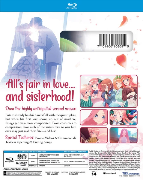The Quintessential Quintuplets Season 2 contains episodes 1-12 of the second season of the anime, directed by Kaori. Also included are 5 art cards (while supplies last).