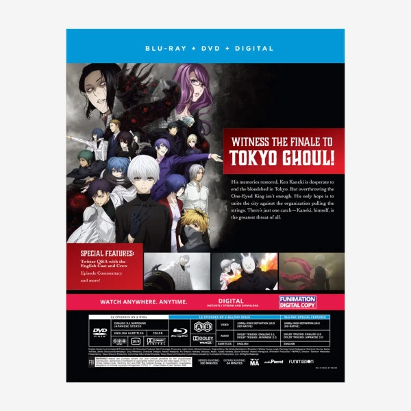 Special Features: English: Twitter Q&A with the ADR Director, Script Writer and the voice actors of Kaneki and Touka, 2 Episode Commentaries, and Textless OP.