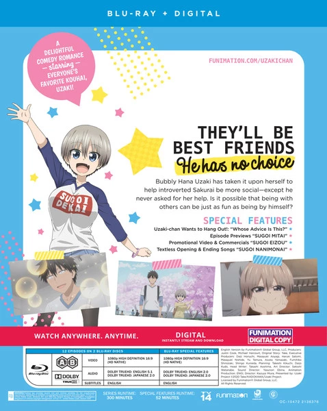 Uzaki-chan Wants to Hang Out! Blu-ray contains episodes 1-12 of the anime directed by Kazuya Miura.