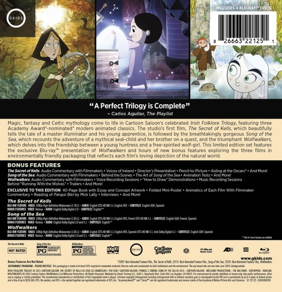 The Secret of Kells – Audio Commentary with Filmmakers, Voices of Ireland, Director’s Presentation, Pencil-to-Picture, Aisling at the Oscars and More.