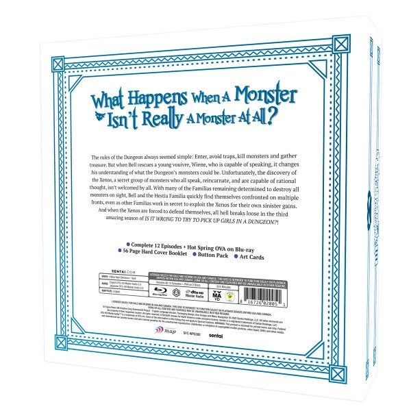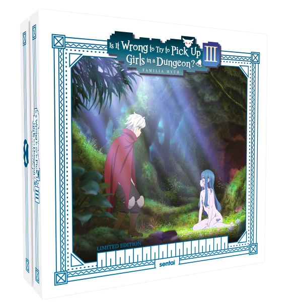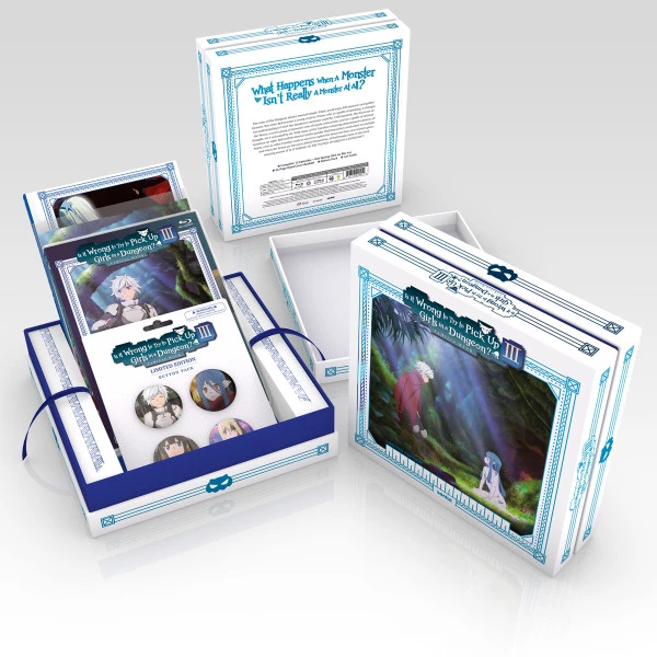 Is It Wrong to Try to Pick Up Girls in a Dungeon?! Season 3 Premium Edition Box Set contains episodes 1-13 of the anime directed by Hideki Tachibana housed in a Chipboard Box and comes with a Hardcover Booklet combining Vol 1-4 + OVA, Artcards, and a Button Pack.