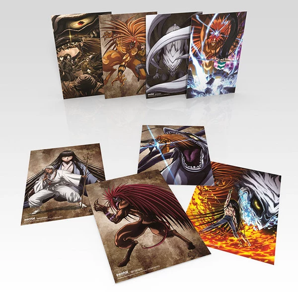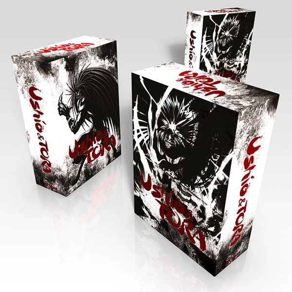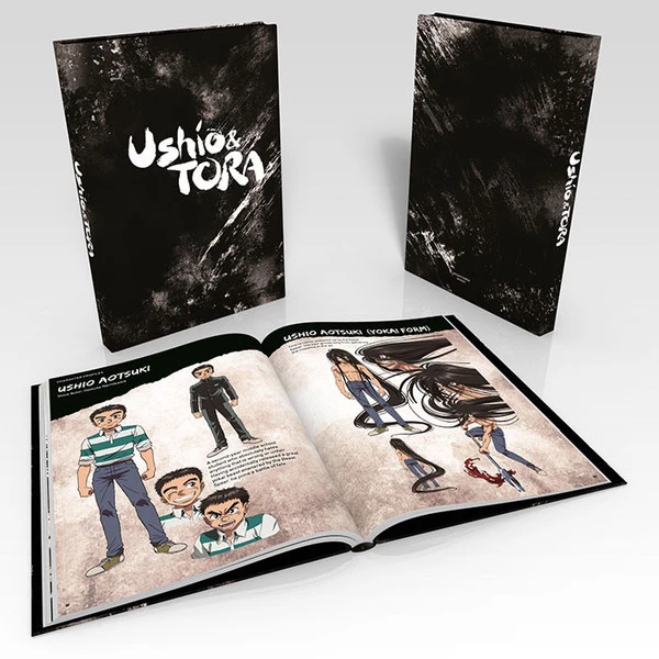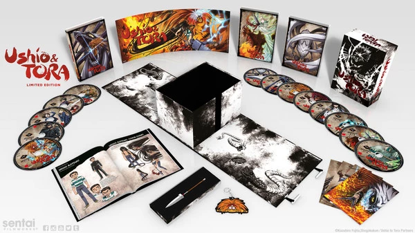 Ushio & Tora Premium Box Set Blu-Ray/DVD contains episodes 1-39 of the anime directed by Satoshi Nishimura, in a Custom Box, plus a Hardcover Booklet, Beast Spear Replica, Tora Key chain, Poster, and Art Cards.