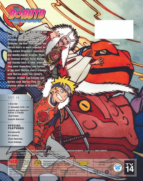 Boruto: Naruto Next Generations Set 10: Boruto Back in Time contains episodes 120-140 of the anime directed by Noriyuki Abe from Studio Pierrot.