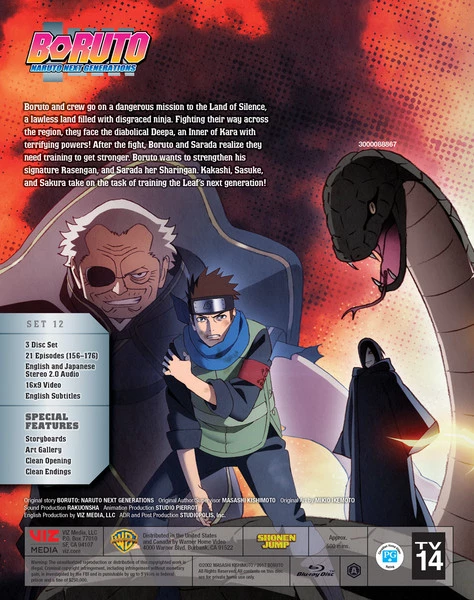 Boruto: Naruto Next Generations Set 12: Kara Actuation contains episodes 156-176 of the anime directed by Noriyuki Abe from Studio Pierrot.