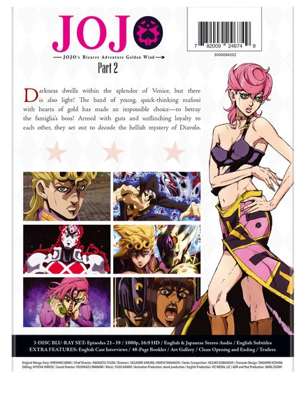 JoJo’s Bizarre Adventure: Golden Wind Set 2 includes episodes 21-39 of the anime directed by Naokatsu Tsuda and includes a 48 page booklet.