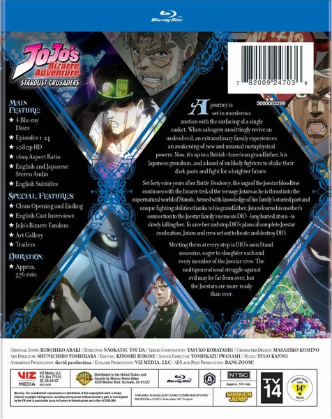 Special Features: Clean Opening and Ending, English Cast Interviews, JoJo’s Bizarre Fandom, Art Gallery, Trailers.