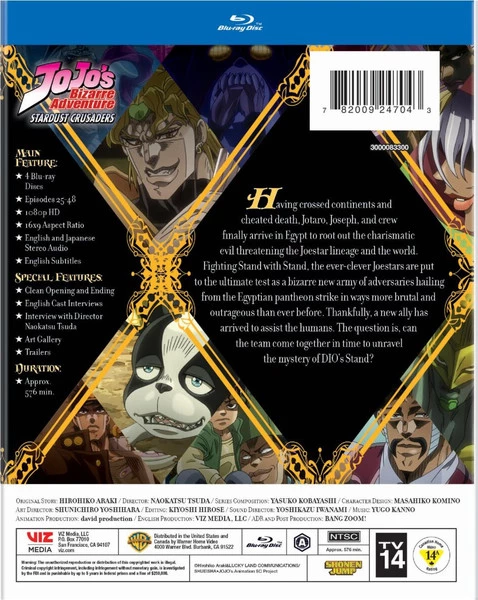 Jojo’s Bizarre Adventure Set 3 Blu-ray contains anime episodes 25-48 which contains the complete Battle in Egypt Arc, directed by Naokatsu Tsuda.
