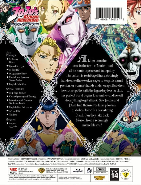 JoJo’s Bizarre Adventure Set 5: Diamond is Unbreakable Part 2 Limited Edition contains episodes 21-39 of the anime directed by Naokatsu Tsuda and includes a 104-Page Booklet.