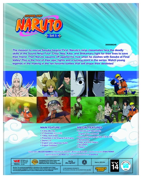 The mission to rescue Sasuke begins! First, Naruto’s ninja classmates face the deadly skills of the Sound Ninja Four! Choji, Neji, Kiba, and Shikamaru fight for their lives to save their friend. Then Naruto squares off against his rival when he clashes with Sasuke at Final Valley! This is the first of their epic fights and a turning point in the series. Watch young legends in the making in the fan-favorite battles that will shape their destinies!