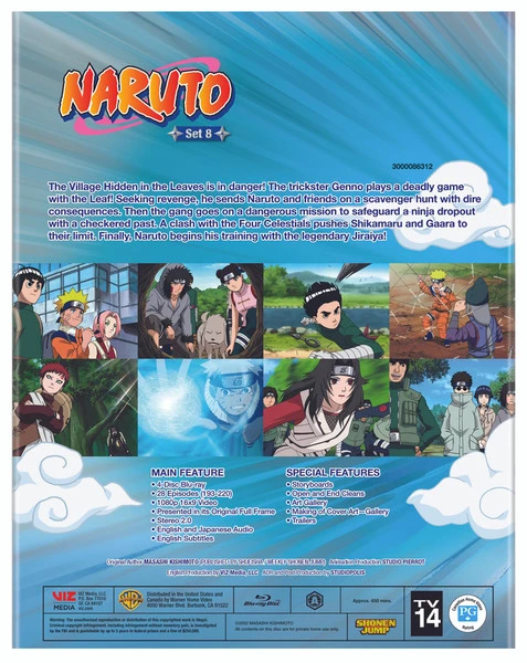 The Village Hidden in the Leaves is in danger! The trickster Genno plays a deadly game with the Leaf! Seeking revenge, he sends Naruto and friends on a scavenger hunt with dire consequences. Then the gang goes on a dangerous mission to safeguard a ninja dropout with a checkered past. A clash with the Four Celestials pushes Shikamaru and Gaara to their limit. Finally, Naruto begins his training with the legendary Jiraiya!