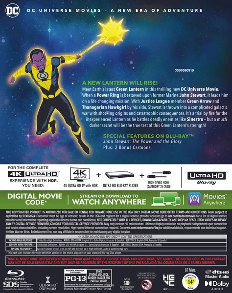 In this thrilling new DC Universe Movie, Earth’s latest Green Lantern will rise! When a Power Ring is bestowed upon former Marine John Stewart, it leads him on a life-changing mission. With Justice League member Green Arrow and Thanagarian Hawkgirl by his side, Stewart is thrown into a complicated galactic war with shocking origins and catastrophic consequences. It’s a trial by fire for the inexperienced Lantern as he battles deadly enemies like Sinestro – but a much darker secret will be the true test of this Green Lantern’s strength!