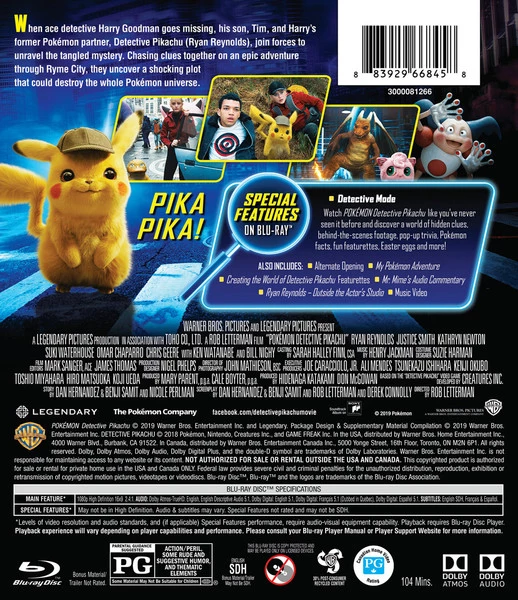 Special Features: Detective Mode, Alternate Opening, My Pokémon Adventure, Creating the World of Detective Pikachu Featurettes, Mr. Mime’s Audio Commentary, Ryan Reynolds – Outside the Actor’s Studio, “Carry On” by Rita Ora & Kygo Music Video.