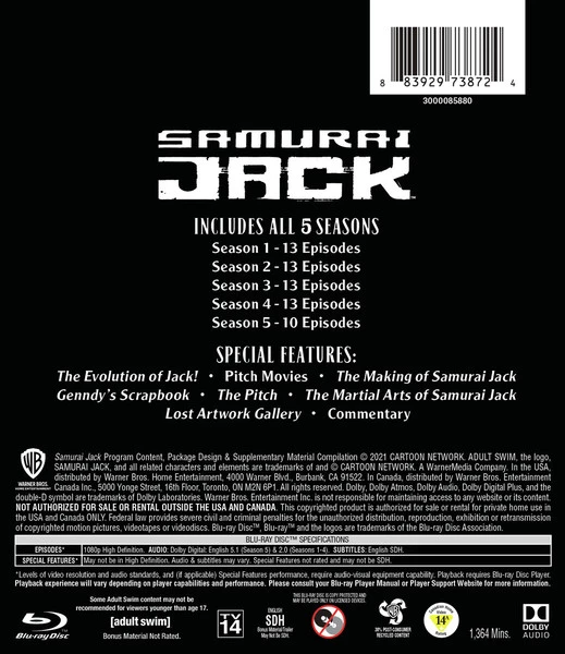 Special Features: The Evolution of Jack!, Pitch Movies, The Making of Samurai Jack, Genndy’s Scrapbook, The Pitch, The Martial Arts of Samurai Jack, Lost Artwork Gallery, Commentary.